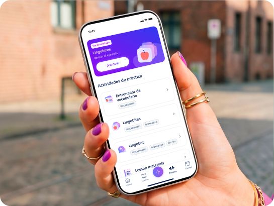 Perfecciona tu gramática y vocabulario con Lingobites, o practica conversaciones reales con Lingobot: nuestro chatbot inteligente impulsado por IA, diseñado para ayudarte a sentirte listo para la vida real.