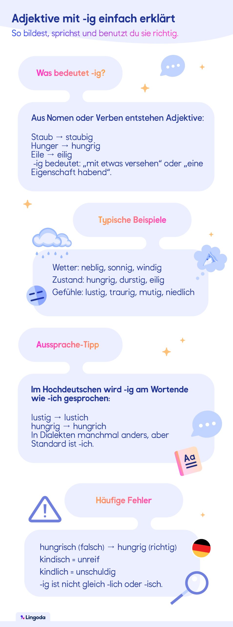 Ein Stolperstein für viele Lernende ist die richtige Aussprache von -ig. Im Hochdeutschen wird die Endung am Wortende fast immer wie -ich gesprochen. Das bedeutet, dass lustig eher wie lustich klingt und hungrig wie hungrich. In der Wortmitte oder vor einem Vokal kann das g erhalten bleiben, zum Beispiel in tigerig.