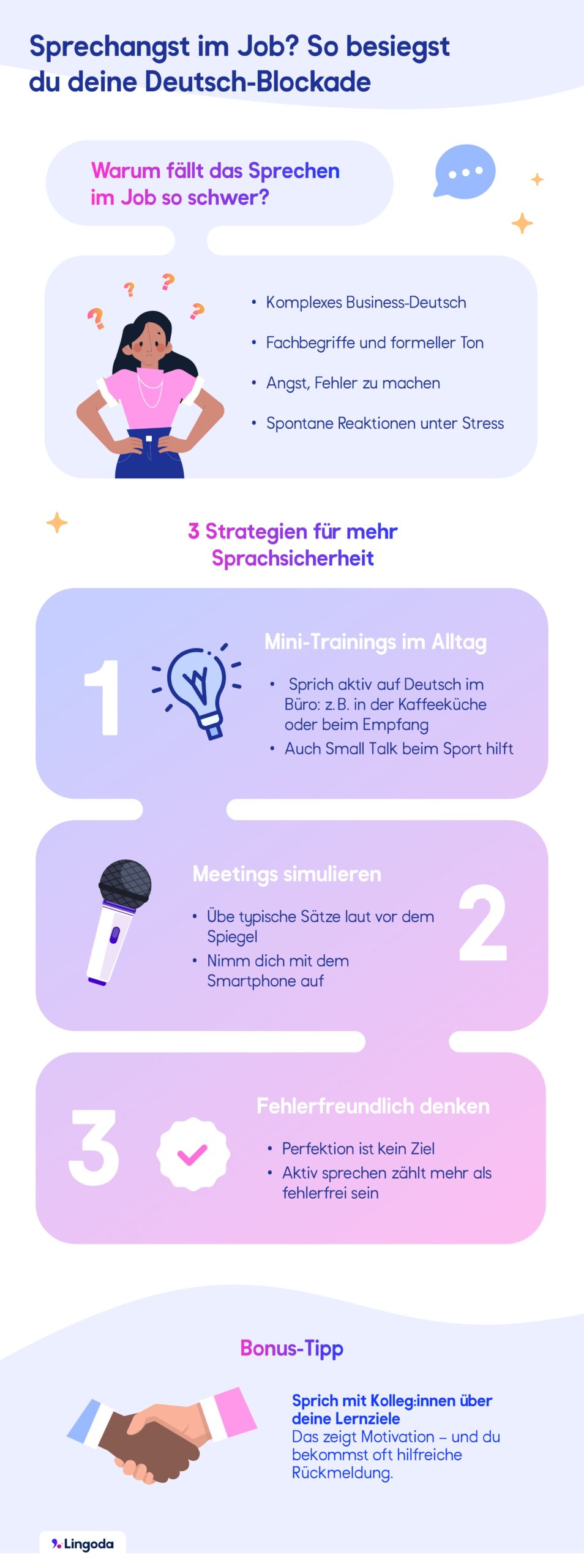 Übung macht auch im Beruf den Unterschied. Versuche, jeden Tag kurze Dialoge bewusst auf Deutsch zu führen. Es kostet zwar etwas Überwindung, aber starte am besten dort, wo du dich wohlfühlst und die Hürde am geringsten ist: etwa in der Kaffeeküche oder beim Empfang. Selbst einfache Sätze bauen die Sprachblockage langsam ab wie: