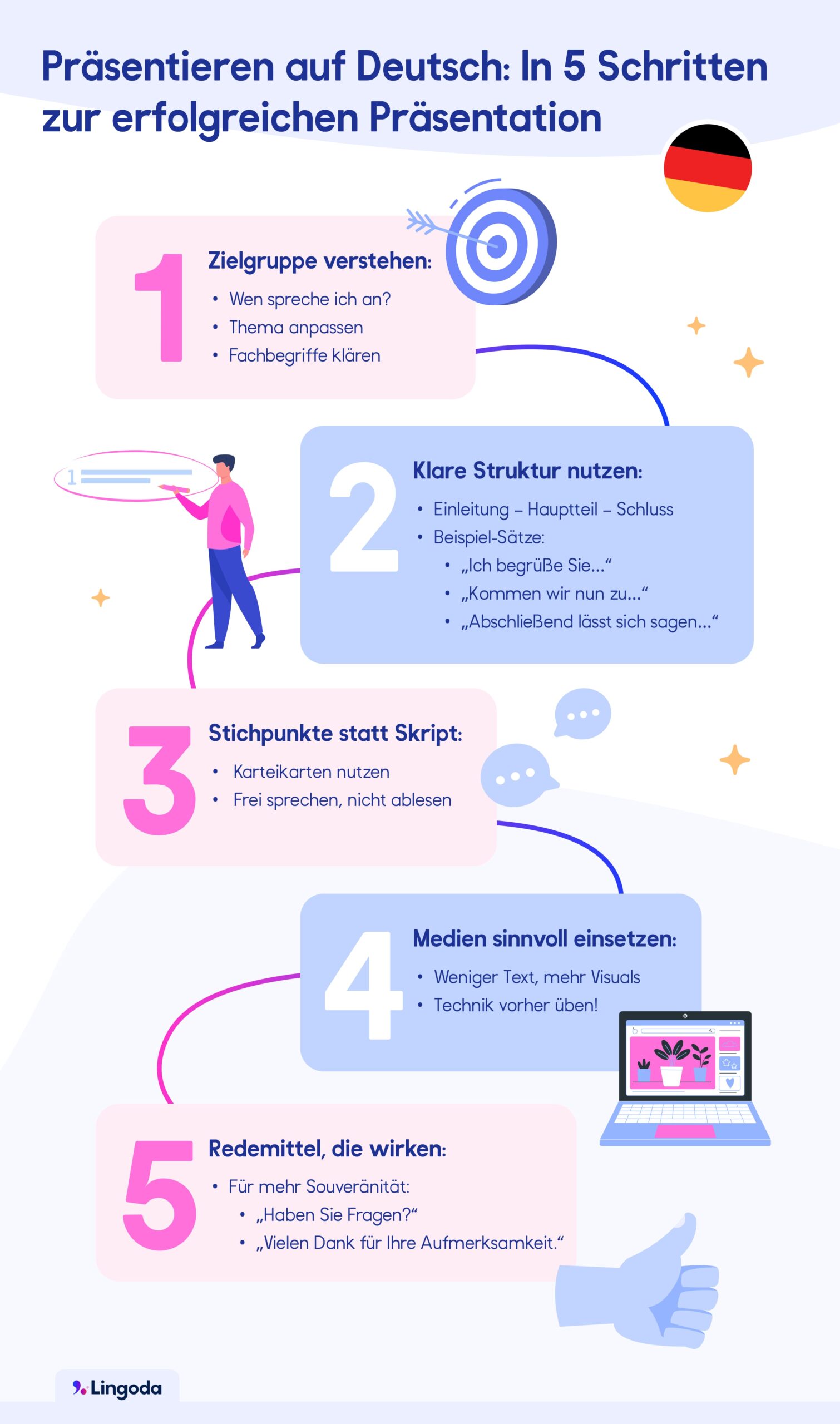 Mit dem Grundsatz “Verständlich statt perfekt” führen wir dich Schritt für Schritt durch die Vorbereitung und zeigen dir Formulierungen und Phrasen, die dir dabei helfen, deine Präsentation vor einem deutschen Publikum selbstbewusst vorzutragen.