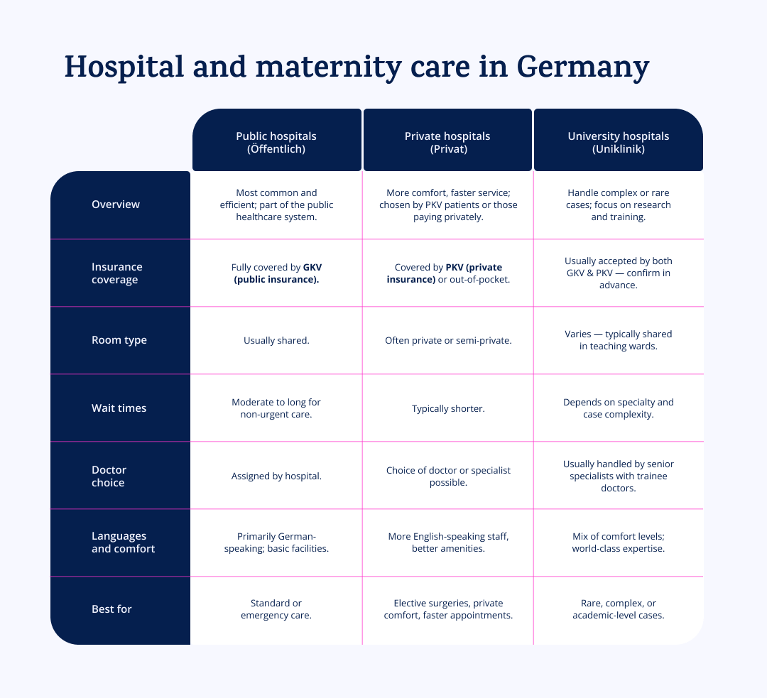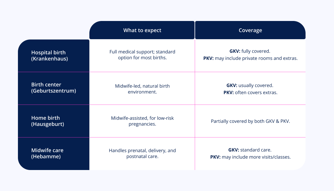 - GKV (public) covers standard prenatal care, hospital delivery and basic midwife services.