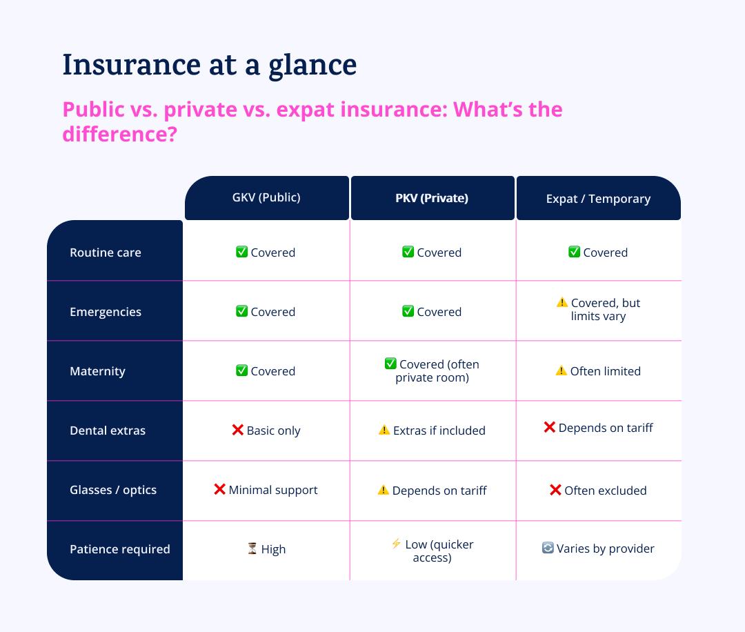 | GKV | PKV | Expat/temporary insurance | |