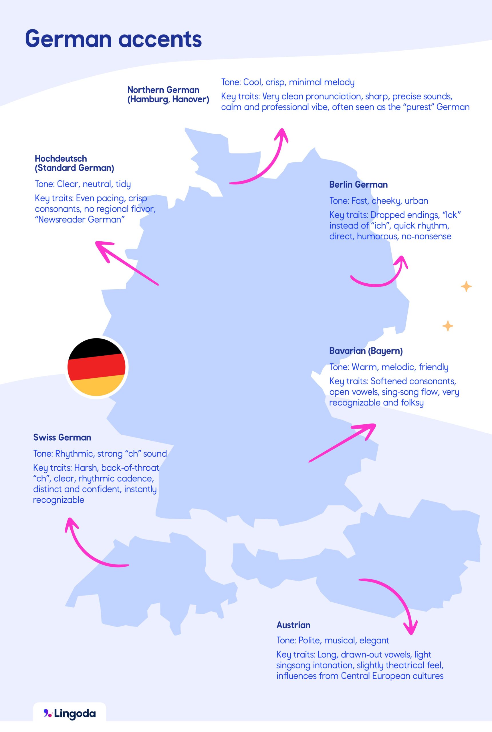 Every German accent tells a story of geography, community and identity — from the clarity of Hanover to the melody of Bavaria, from Swiss rhythm to Berlin attitude. Each version has its own flavor and none is better or worse; they’re just different.
