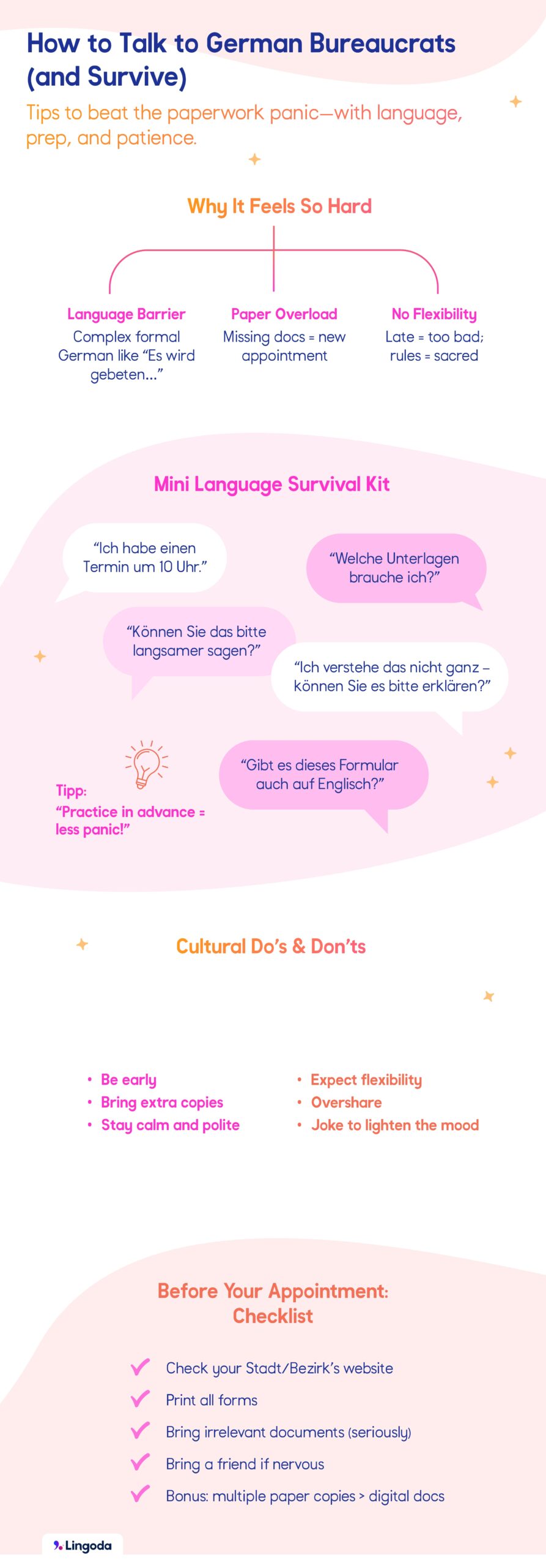 In fact, these official moments are golden opportunities to practice real, useful German. You’re not just handing over documents — you’re communicating your way through a complex system and gaining confidence with every small win.
