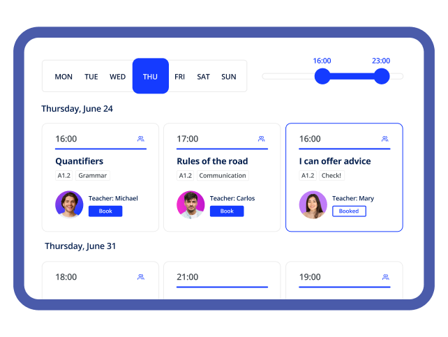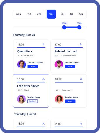 Manage your subscription, book classes, organise your schedule, view all lessons within a level (A1.1, A1.2, etc.) and track the number of class credits remaining for the month.