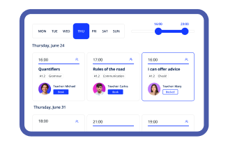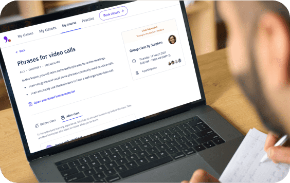 Each class is topic-based, 60 minutes long, and led by a different teacher. They will guide you through the lesson plan and exercises, and encourage you to practise speaking.