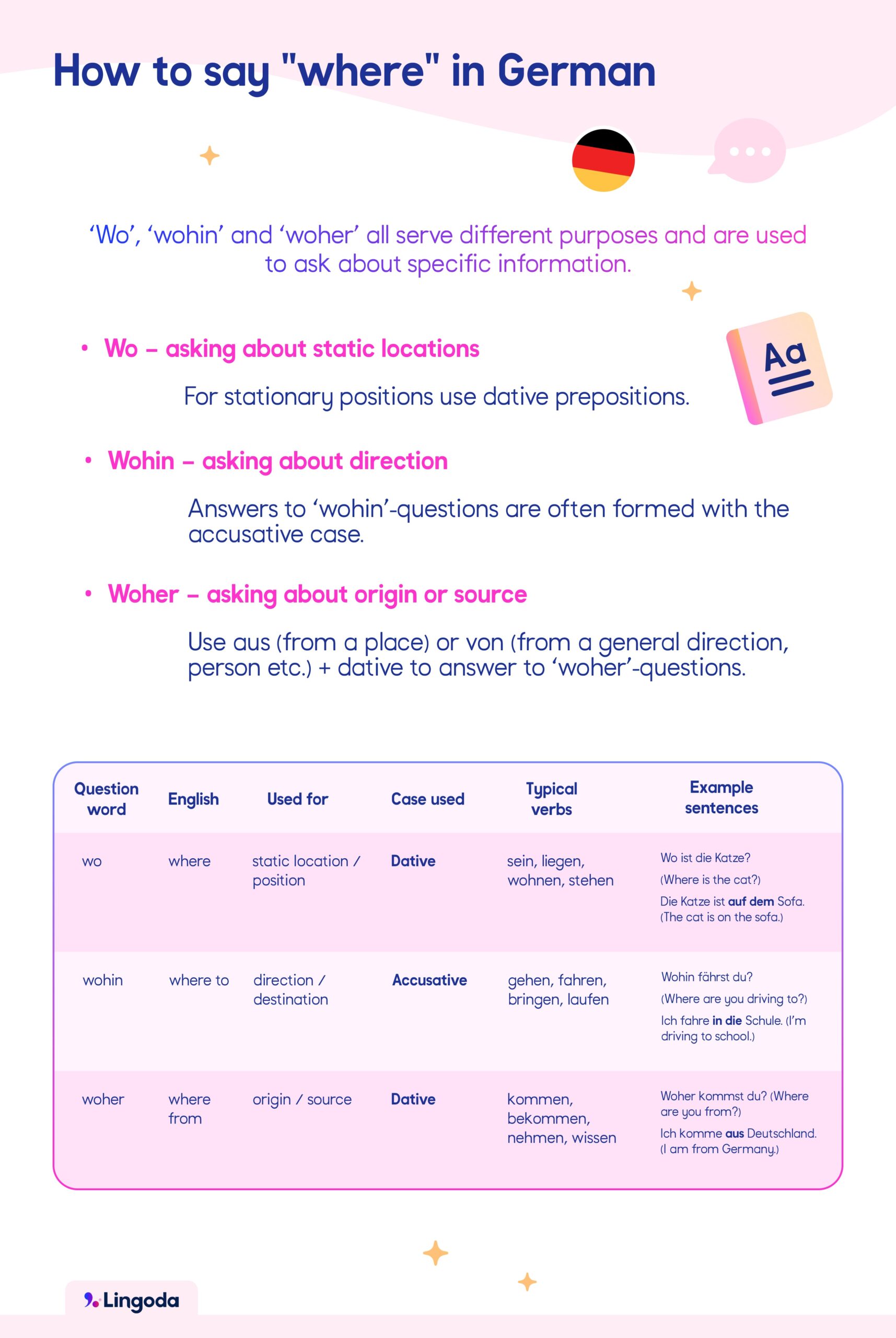 Introducing ‘wo’, ‘wohin’ and ‘woher’