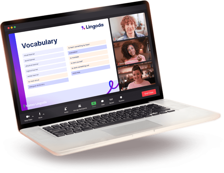 Puedes descargar los materiales del curso de forma gratuita desde tu cuenta de estudiante. No se requieren materiales adicionales ni libros de texto. Además, Lingoda ofrece deberes y un cuestionario para que practiques después de tus lecciones.