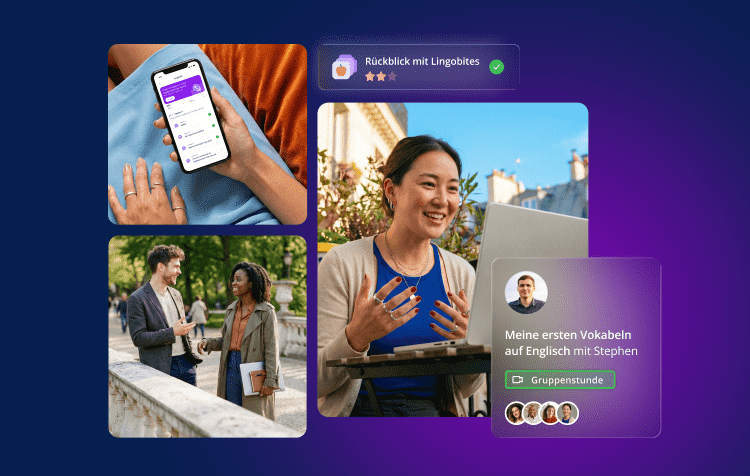 Unser Lernbereich ist auf allen Geräten und über unsere mobile App verfügbar. Du kannst Unterrichtsstunden buchen, Vokabeln wiederholen oder das Gelernte mit unseren interaktiven und KI-basierten Übungen üben.