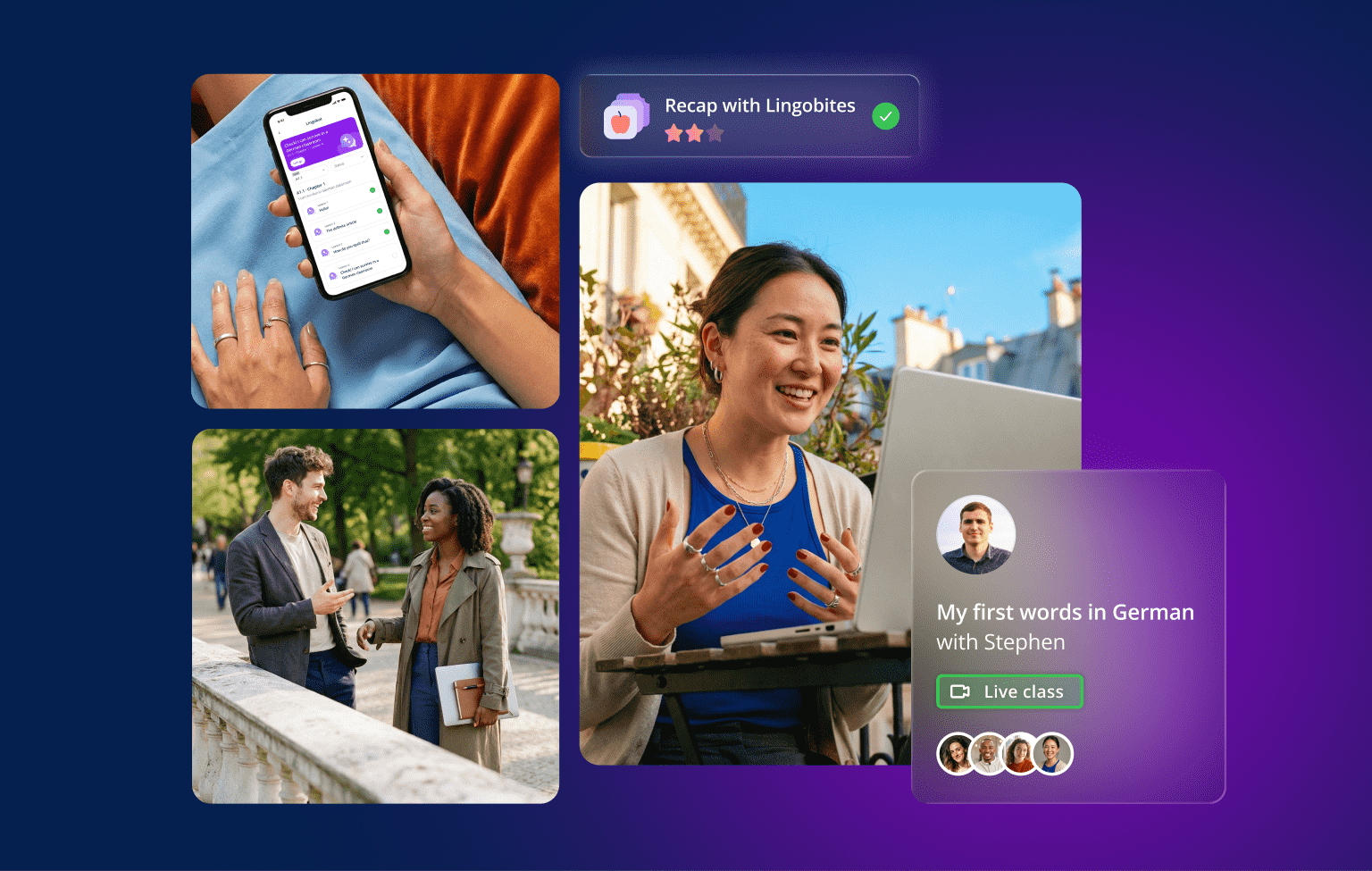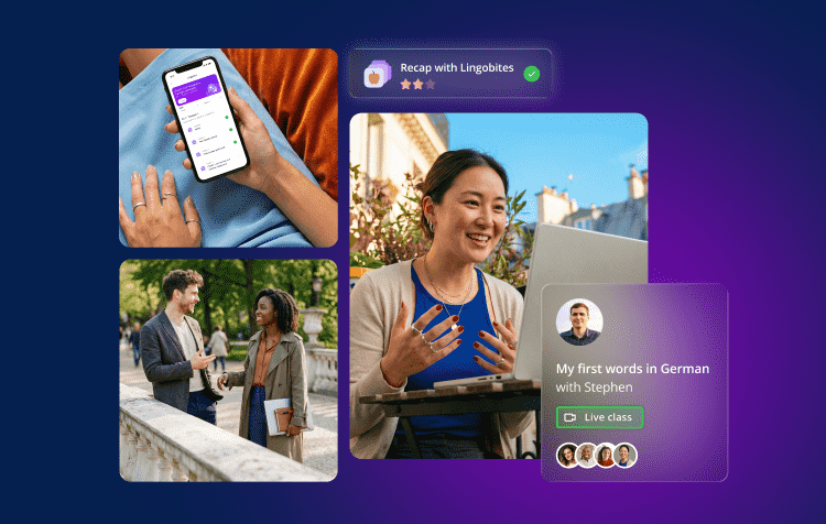 Learning doesn’t stop with our classes. In our study area, you’ll find smart, personalised practice tools, such as flashcards or Lingobites. You can also download our mobile app to keep practising what you’re learning at any time.