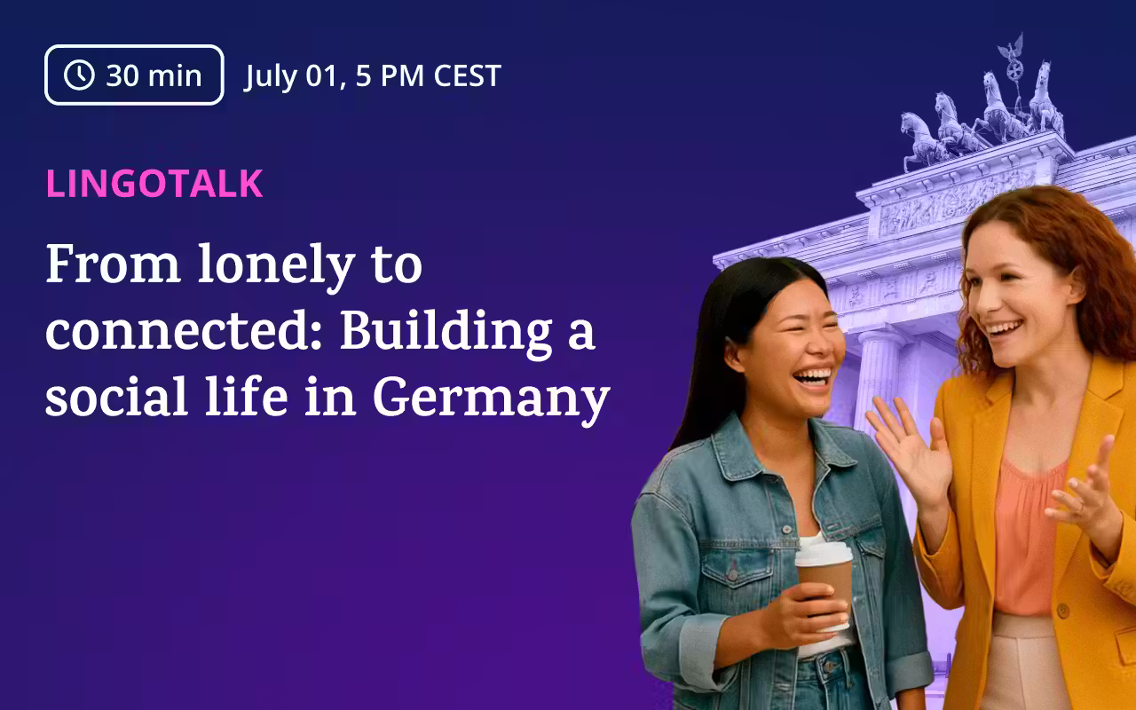 Just landed in Germany and feeling more ghosted than greeted? Making friends here can feel harder than figuring out your electricity bill. You’re not alone — this free 45-minute webinar will help you go from awkward hellos to real connections. Join us live to get exclusive perks like a live Q&A with our experts, language tips from a certified Lingoda teacher, and a special bonus offer available only during the session. This webinar is all about helping you tackle one of the trickiest parts of life in Germany: building real social connections. From cultural quirks to small talk skills, we’ll share practical advice to boost your social life. We’ll talk about how to ease into low-pressure social situations, why joining a "Verein" could be your secret friendship hack, and a few handy German phrases to help you connect. Ready to stop feeling like the new kid at lunch? Sign up now — your future friends are waiting.