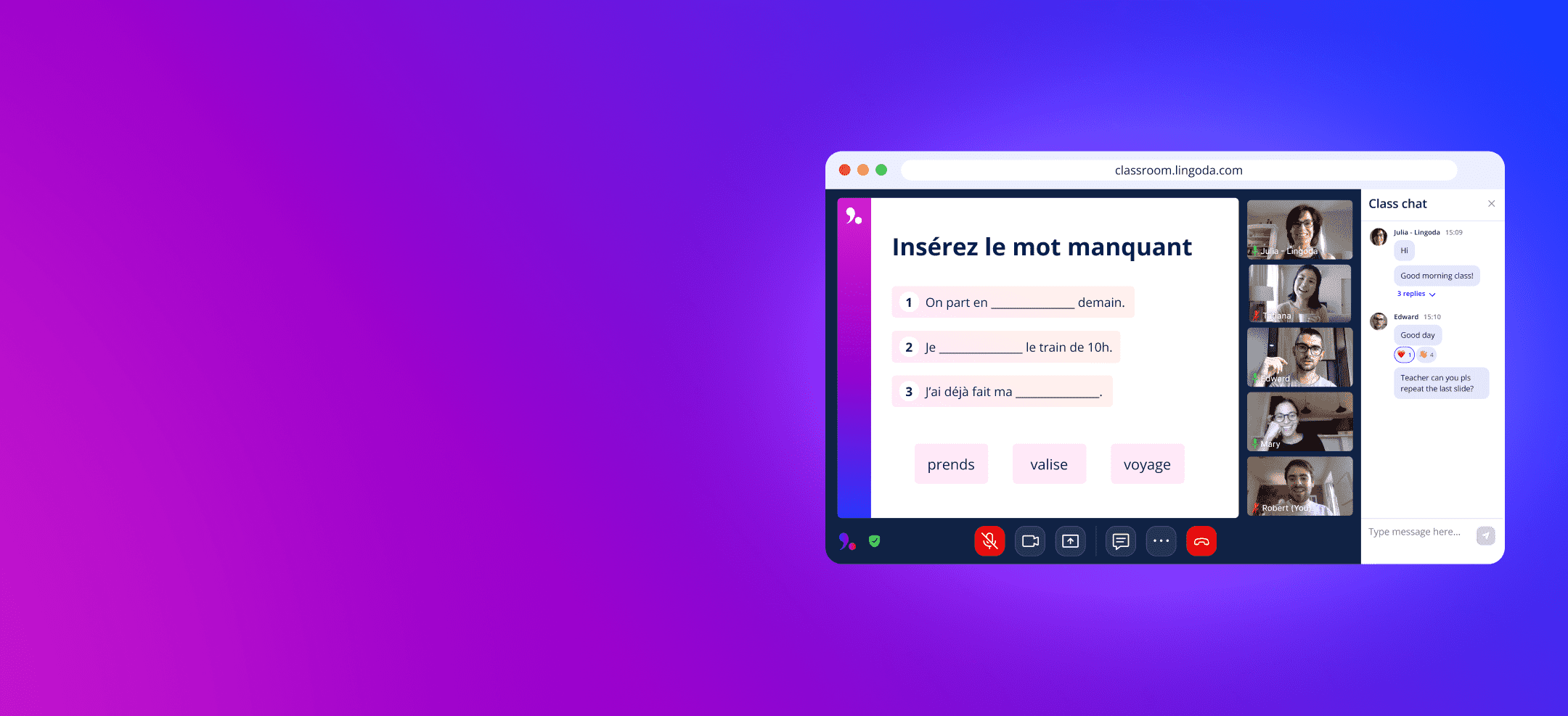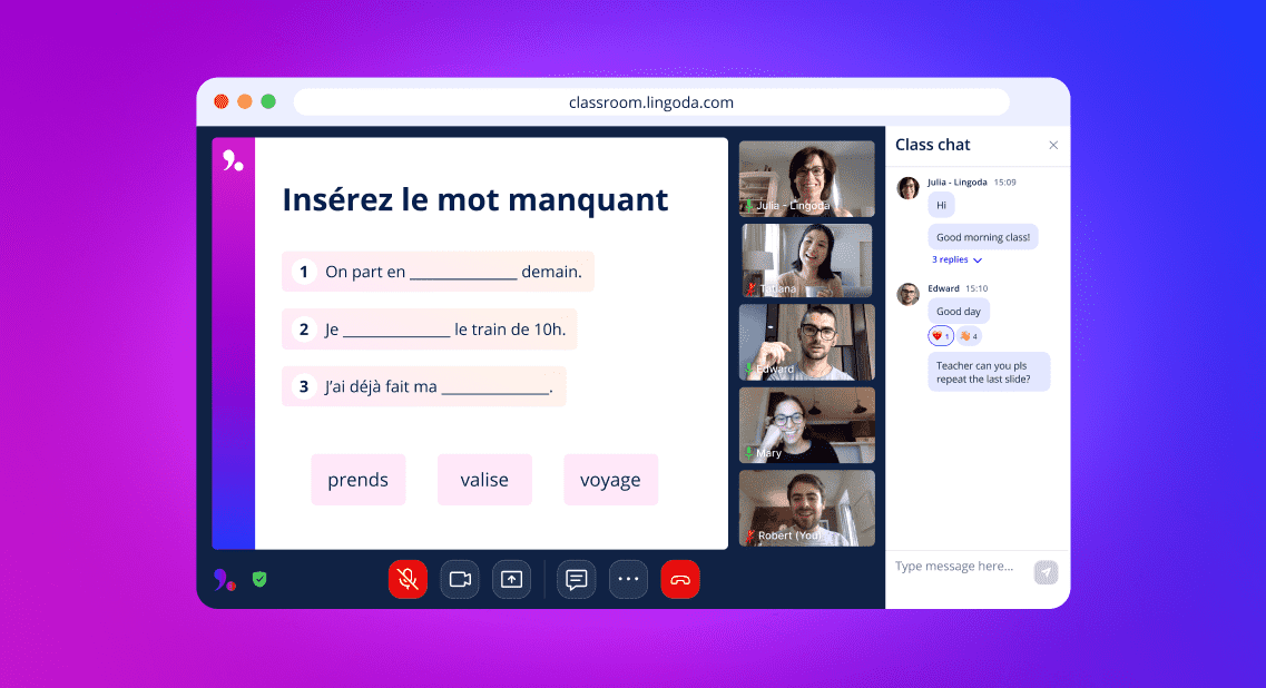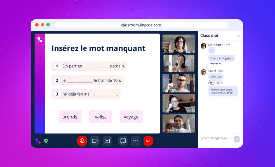 After scheduling a French class on our platform, you will be able to join the class with 2-4 fellow students from around the world. The teacher will introduce themselves and begin teaching the lesson using learning materials that you can download at the end of class. You will be able to interact with the teacher and other students, but there is no pressure to do so. Towards the end of class, the teacher will recap the lesson and ensure everybody has understood the lesson.