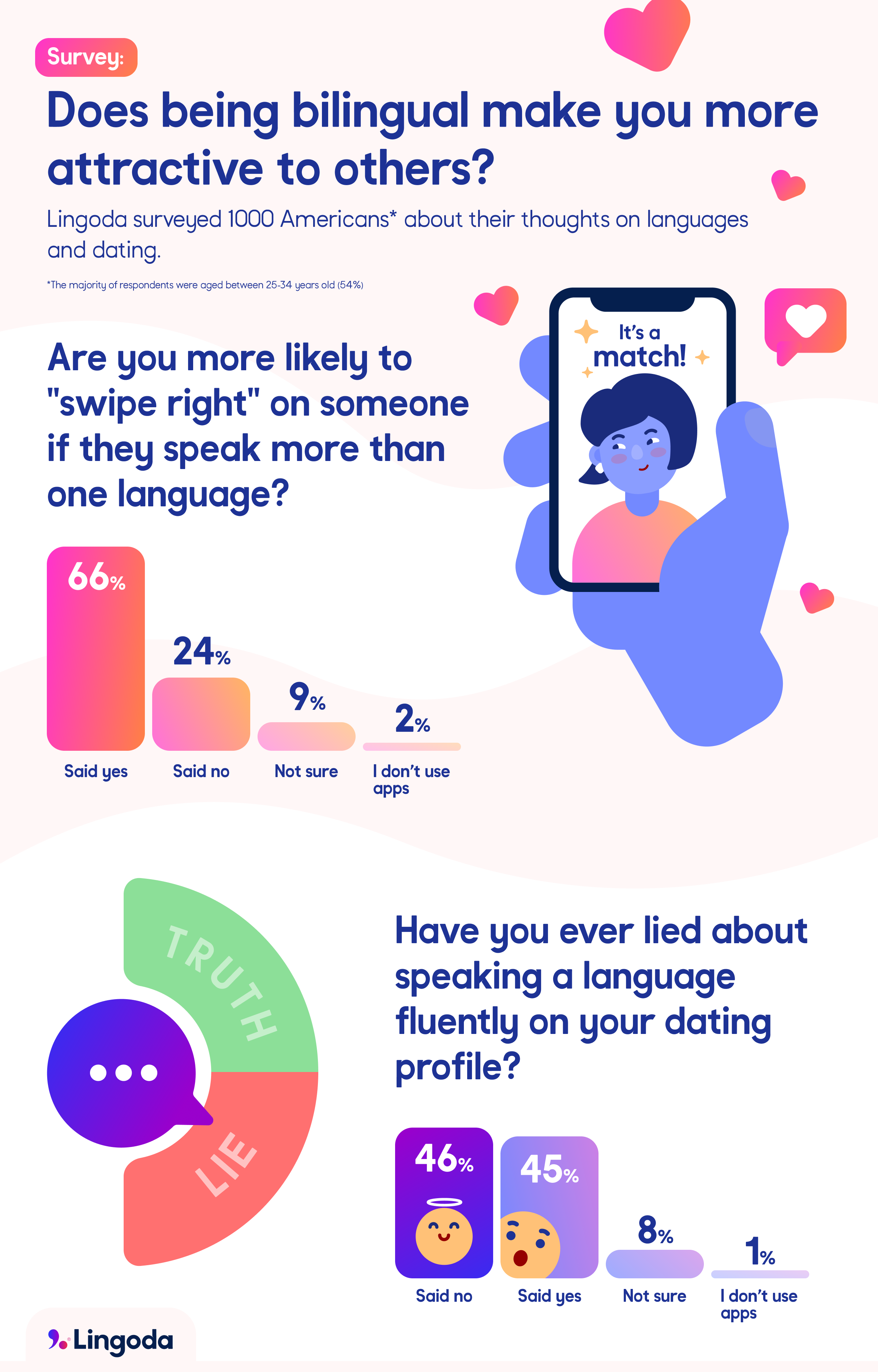 So there you have it: A large majority of American singles would swipe right on someone who speaks more than one language. So if you speak several languages, go ahead and list it on your profile to increase your chances of matching with a potential partner. But be wary of false bilinguals: 45% of respondents also said they have lied on their profile about the languages they speak.