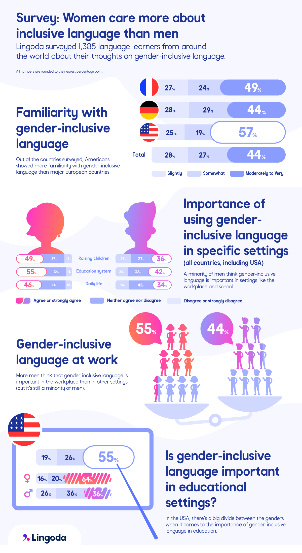 The online language learning platform Lingoda surveyed over 1,300 students and found that students from the USA were most familiar with gender-inclusive language: 57% of respondents said they were moderately or very familiar with it, while Germany and France only reached 44% and 49%, respectively.
