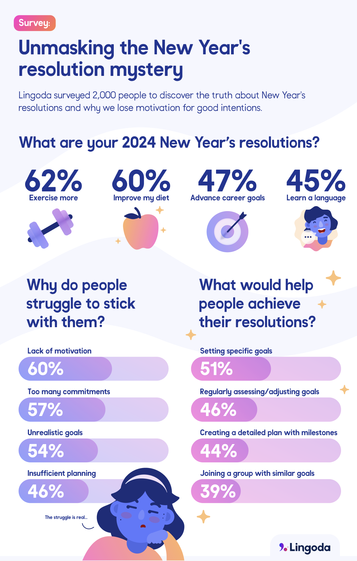 In line with New Year’s themes, Lingoda could not but dive into our readers’ hopes for 2024. Asking them what kind of changes they would be willing to make, three main areas emerged: