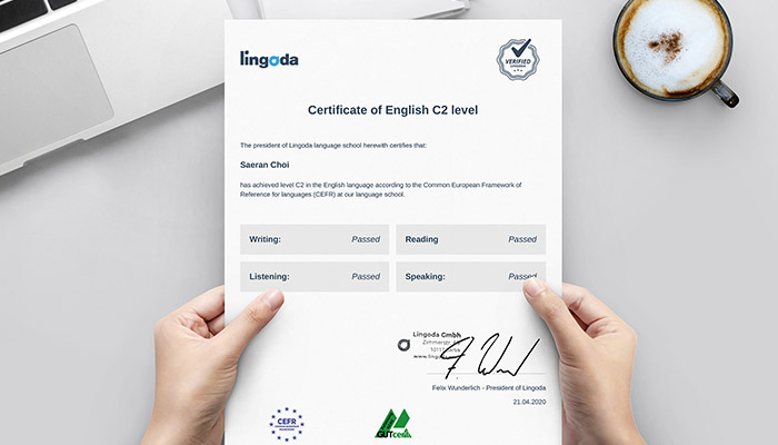 ¡Muéstrales a todos lo lejos que has llegado! Después de completar cada nivel, puedes demostrar tus habilidades con un certificado de Lingoda de acuerdo con el MCER.