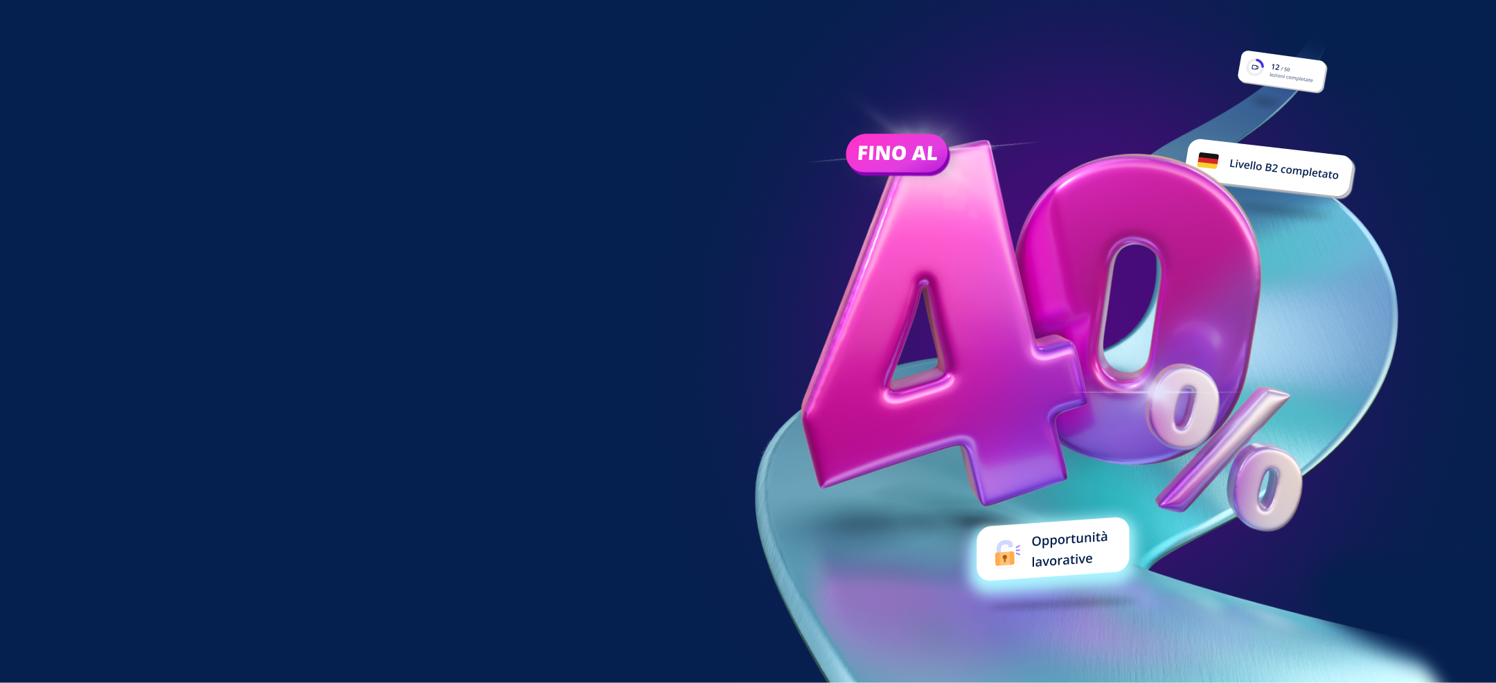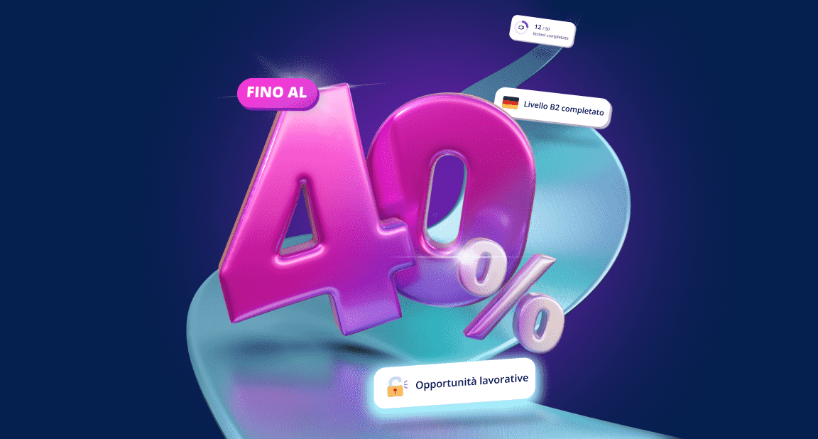 Inizia l’avventura nell’apprendimento delle lingue con la nostra grande offerta Black Friday su Lingoda Flex! Disponibile per gli acquisti effettuati tra il 13 novembre e il 9 dicembre (fino alle ore 10:00 CEST): risparmia il 30% sul piano M, il 30% sul piano L e il 40% sul piano XL. Il piano S è escluso da questa offerta. Lo sconto si applica solo al primo mese ed è disponibile per i nuovi studenti che non hanno mai avuto un abbonamento Lingoda attivo (ad eccezione della prova gratuita). L’offerta non è cumulabile con altre promozioni.