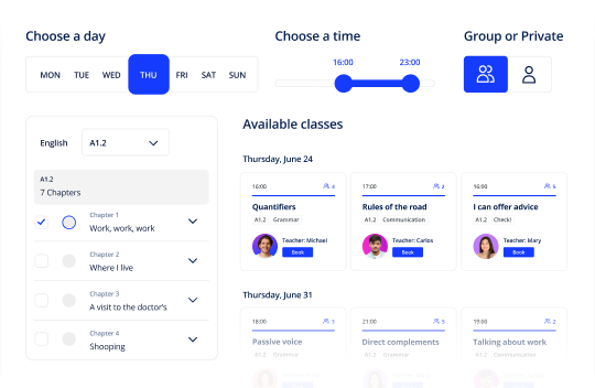 Wybierz lekcje, śledząc nasz program nauczania lub wybierz je według tematu. Zarezerwuj dzień i godzinę, która ci najbardziej odpowiada.